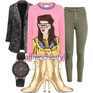 Gucci Unskilled Worker! I enjoy quirky, fun and classic styles all mixed up in one. This entire look is a mix of High and Low End which is my favorite.  I added the Jimmy Choo Daize Boots playing on the gold in the sweater for a chic vibe.  It’s all about the sweater and the boots in this look.  Adding the Armitron Women’s Diamond Leather Watch from Kohls adds a smart and classic sophistication to give balance to the tweed coat.